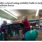 Why is posture so important? A lot of benefits: Better blood flow, for one. And it helps kids keep their attention, to stay focused. The ball doesn’t allow you to sit poorly because if you do, you’ll obviously end up on the floor. Anybody take a spill yet No, we’re still on chairs, going through a curriculum about the ball, the history of it and how it works. That will take three or four weeks, and then they will have to take an exam. The students will have to get parent permission slips before we start using the balls.Then we’ll do lots of practice, minus the instruments. Eventually, if the funds come through, ideally the kids will be on the balls every day. Have you tried this yourself? I did try it. It’s interesting how much I can feel it in my stomach. You’re just so much more aware of sitting upright. I would go one way or the other if my legs weren’t in the right spot Is anyone else using exercise balls in this way? I talked to the people who have developed this program for schools.